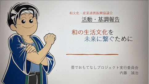 まずは「和の生活文化を未来に繋ぐために」というタイトルで 「畳でおもてなしプロジェクト」の企画責任者の内藤誠治氏から、和文化・産業連携振興協議会の設立の目的から、今までの経緯や活動について『基調報告』がなされました。